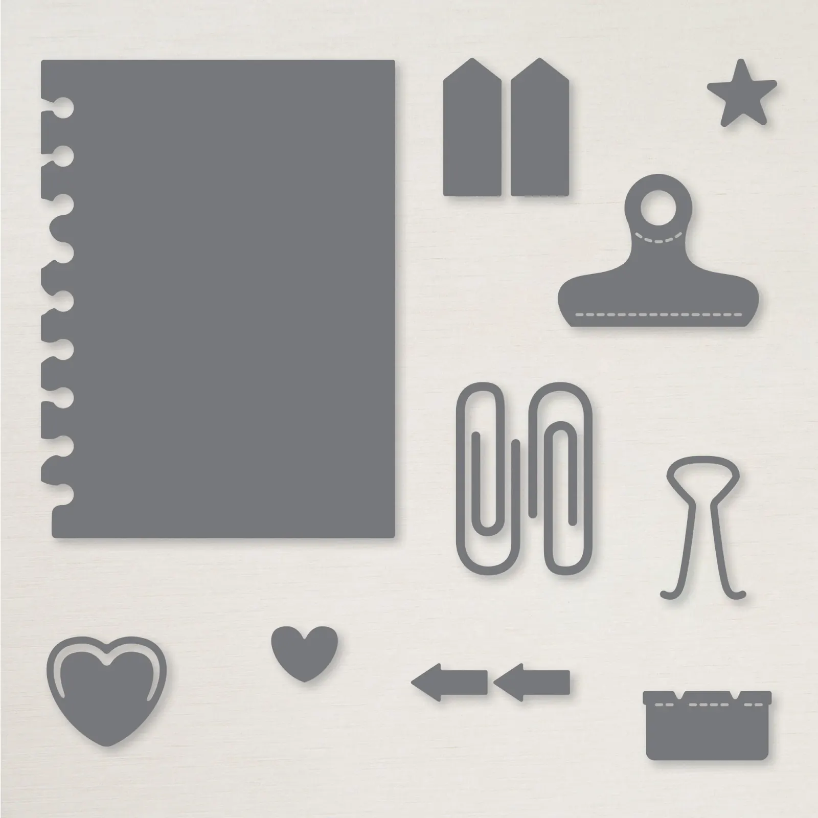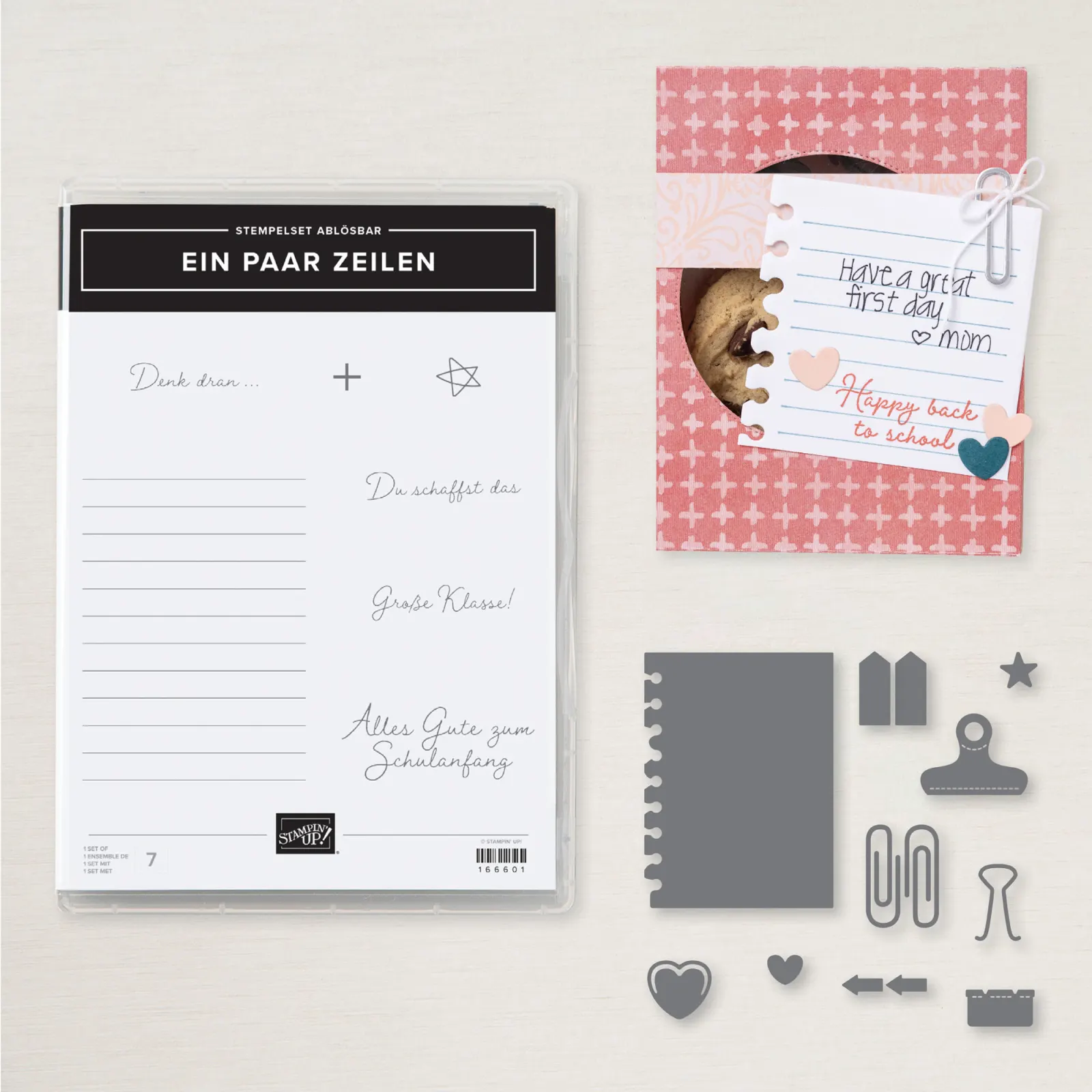 Gratulieren Sie Ihrem Lieblingsschulkind mit einem handgefertigten Gruß und liebevollen Worten zum Schulanfang! Die Stanzformen Ein paar Zeilen schneiden eine gelochte Kante ins Papier, damit es wie eine Seite wirkt, die aus einem Notizbuch gerissen wurde. Schmücken Sie Ihre Seite noch mit ausgestanzten Elementen im Look von Papierklemmen, Büroklammern, Etiketten, Haftmarkern und Register-Reitern.