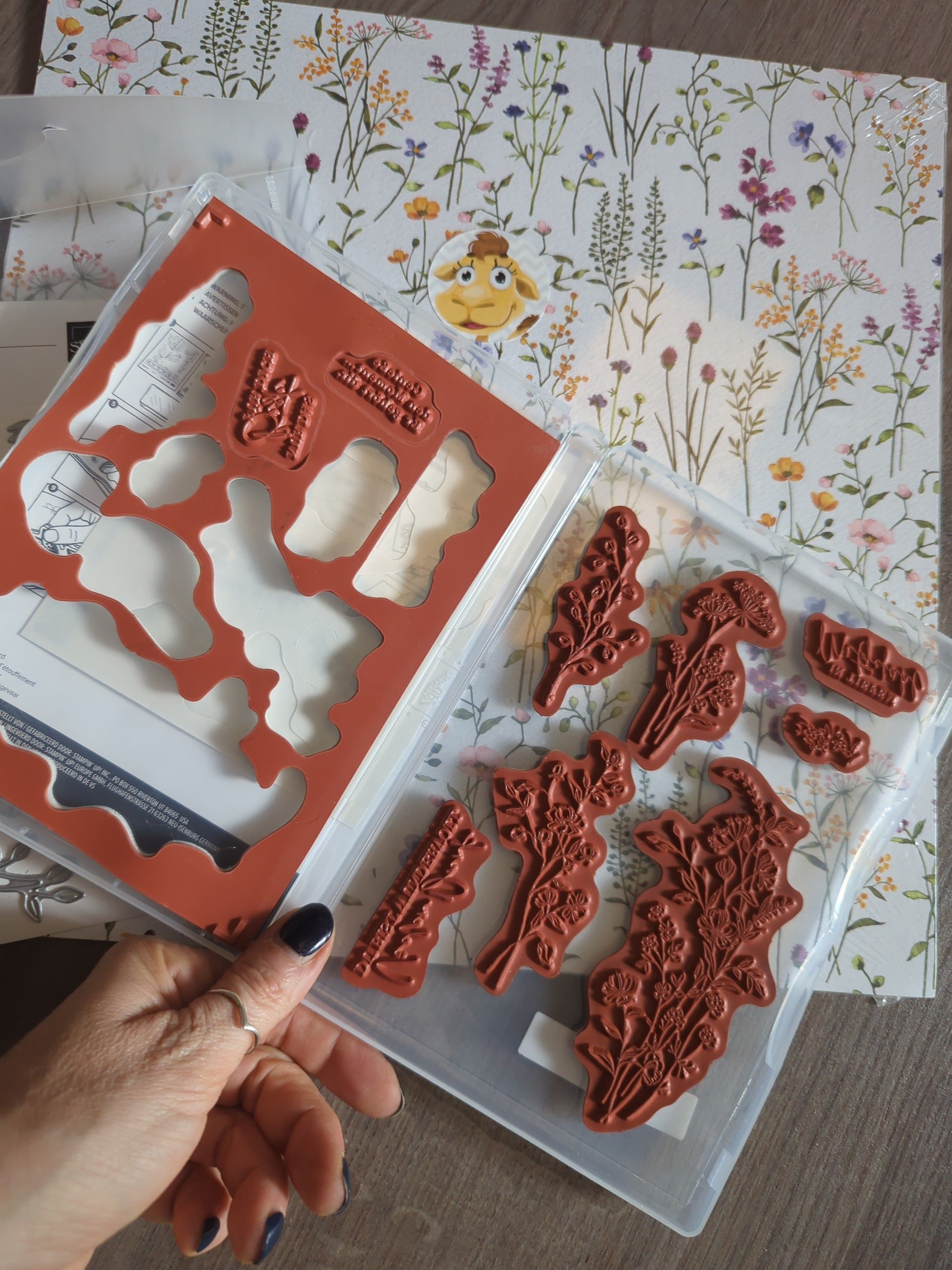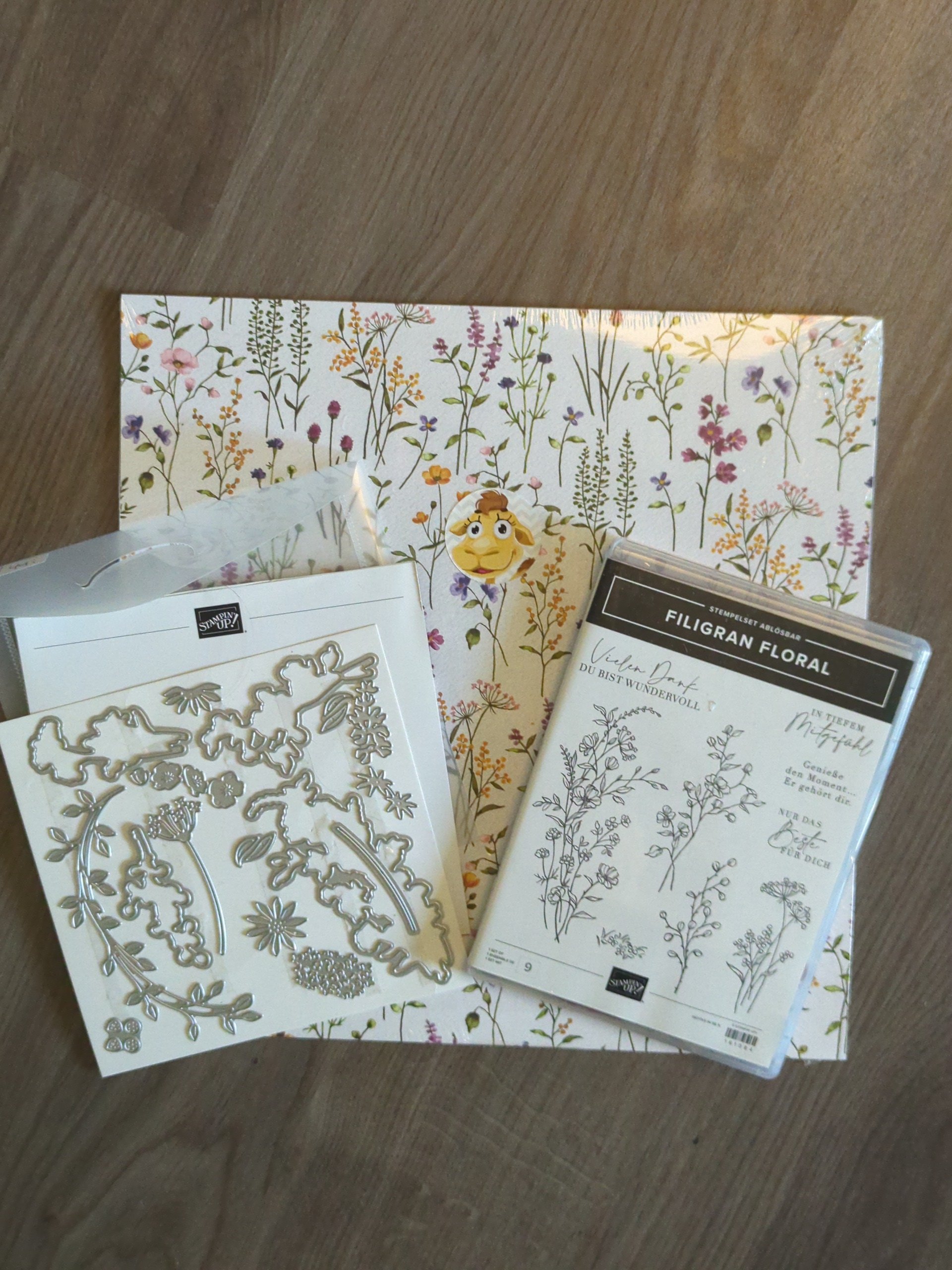ein wenig gebrauchtes Gummi-Stempelset mit passenden Stanzformen und kpl Packung 12×12″ Designerpapier filigrane Blumen